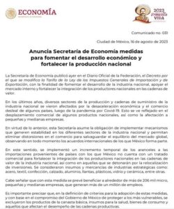 La Secretaría de Economía publicó en el Diario Oficial de la Federación, el Decreto por el que se modifica la Tarifa de la Ley de los Impuestos Generales de Importación y de Exportación, con la finalidad de fomentar el desarrollo de la industria nacional, apoyar el mercado interno y fortalecer la integración de los productores nacionales en las cadenas de valor.